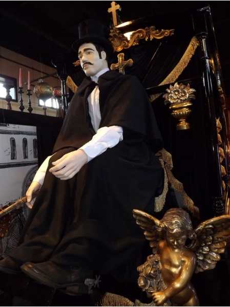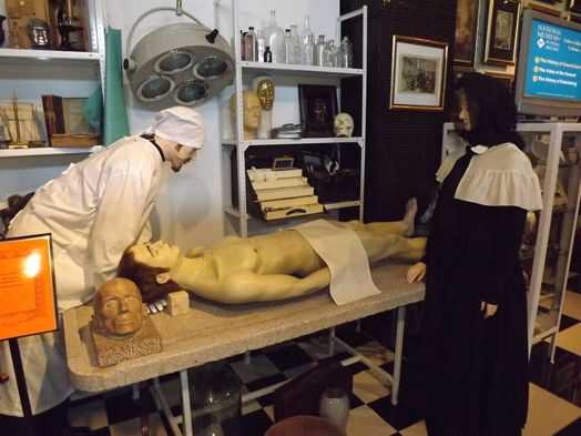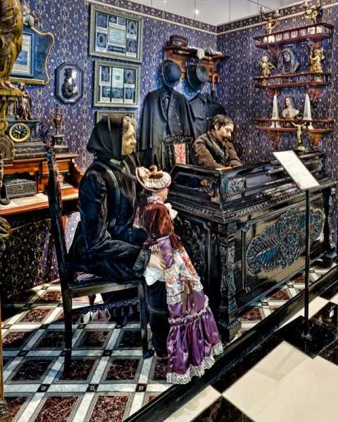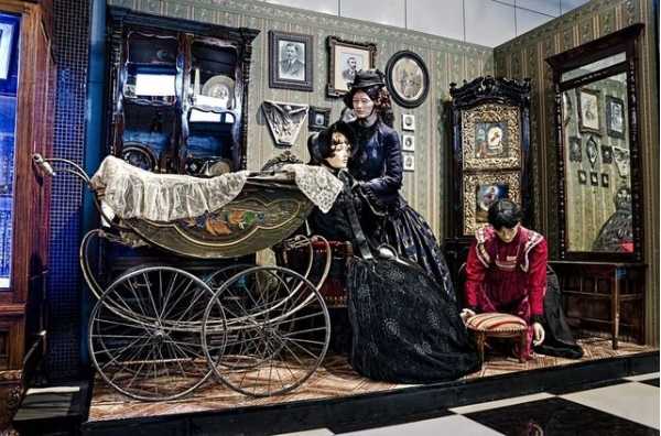 Многие аспекты старинной погребальной культуры представлены в виде сюжетных инсталляций-диорам. Опознание в старинной прозекторской, прием заказа в погребальной конторе, пошив траурного платья, прощание родных с умершим ребенком – все сюжеты в детально воспроизведенных интерьерах разыгрывают манекены, облаченные в одежду XIX века. От своих магазинных собратьев они отличаются и типажами, и эмоциональным состоянием. Никаких улыбок, никакого кокетства. У некоторых на лицах при помощи специальной слюды даже изображены слёзы.