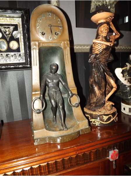 Похожие одновременно на портал склепа и отбойник паровоза часы с латинской надписью TEMPUS FUGIT (время бежит). Это паровозом напирающее время хватает за кольца отчаянный атлет. Вот такие бытовые приборы рождала томная, склонная к пессимизму и меланхолии эпоха art noveau.