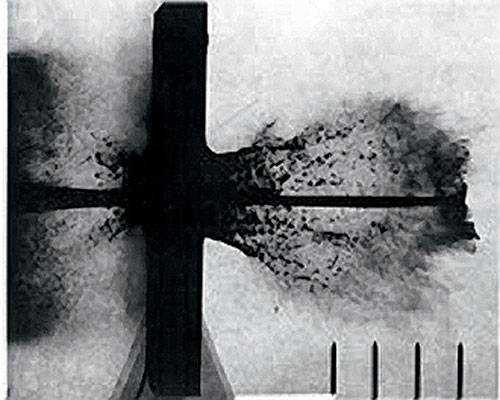 При этом происходит значительное вспучивание прокладки и тонкого листа. Когда струя пробивает прокладку и тонкую пластину, последняя уже начала движение в сторону от тыльной поверхности плиты. Поскольку между направлениями движения струи и тонкой пластины имеется некоторый угол, то в какой-то момент времени пластина начинает набегать на струю, разрушая ее. В сравнении с монолитной броней той же массы эффект от использования «отражающих» листов может достигать 40%.