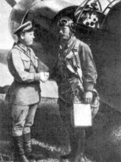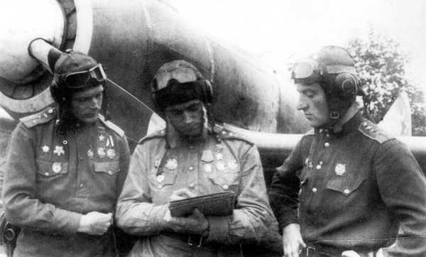 Летчики-асы 5 ГИАП — Г. А. Баевский, В. И. Попков и Еременко — изучают по карте район своего следующего боевого вылета, Польша, аэродром Држешковице, лето 1944 года. Обратите внимание на белые законцовки лопастей винта, характерные для самолетов этого полка.