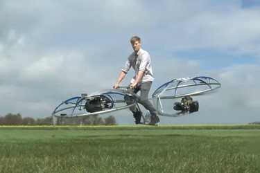 Этот неманевренный, негрузоподъёмный, сложно-управляемый ховербайк был выдуман и собран британским изобретателем Колином Ферзом. Всего за три месяца из кучи алюминиевых профилей и двух двигателей с винтами Колин своял вот такой вот летательный аппарат.