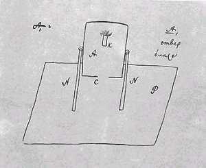 «… в цилиндре А, имеющем в нижнем дне отверстие С, устанавливается по оси ближе к верхнему дну пороховая свеча К (так я буду называть цилиндрики из спрессованного пороха). Цилиндр А посредством стоек N прикреплен к средней части платформы R, на которой должен стоять воздухоплаватель… Представим теперь, что свеча К зажжена. Через очень короткий промежуток времени цилиндр А наполнится горючими газами; часть которых давит на верхнее дно цилиндра, и если это давление превосходит вес цилиндра, платформы и воздухоплавателя, то прибор должен подняться вверх».
