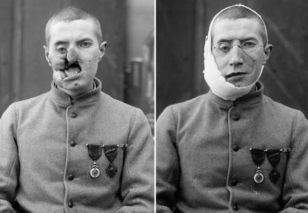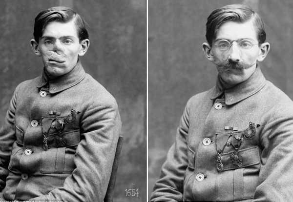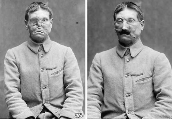 В британской армии насчитывалось порядка 60 тыс. солдат, которые получили ранение в лицо, причем не только из-за прямого попадания пули (часто в глаз), но также из-за осколков гранат или снарядов. Во Франции 9900 солдат с изуродованными лицами объединились после войны в особый ветеранский союз. Под ударом оказывались авиаторы и моряки, лица которых чаще всего получали тяжелые ожоги в ходе сражений. Всем этим людям потребовалась помощь после того, как они, обезображенные, были доставлены домой. Многим британцам помог вернуться к нормальной жизни новозеландский врач Гарольд Джиллес, который стал пионером пластической хирургии, возглавив специальный госпиталь в Сидкапе, городке близ Лондона. Тогда пластическая хирургия была очень болезненной и чрезвычайно опасной, поскольку пациентам грозил сепсис, а антибиотики еще не были изобретены.