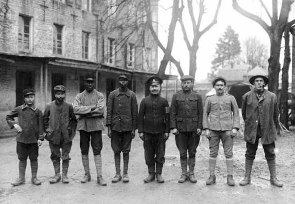 6.На Западном фронте, группа пленных солдат из союзнических войск, представляющих 8 стран: Аннам (вьетнамец), тунисец, сенегалец, суданец, русский, американец, португалец и англичанин. / (National Archive/Official German Photograph of WWI)