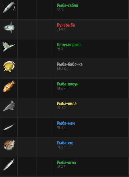 Рыба в Black Desert разделена по грейдам (синий, зеленый и тд., а также красный) и типам (камбала, рыба-меч и тд.). Чем выше грейд – тем дороже себестоимость рыбы, а разные типы рыбы применяются в различных рецептах.