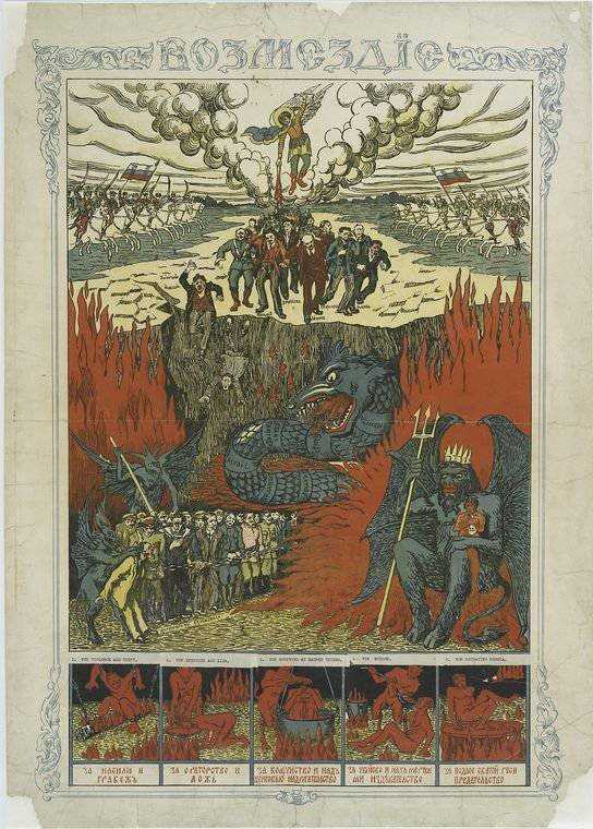 Этот плакат говорит о том, что большевикам самое место в аду.