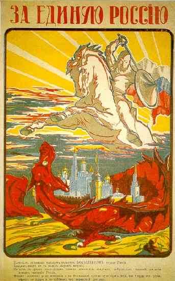 Плакат «За единую Россию» Плотным злобным кольцом охватил БОЛЬШЕВИЗМ сердце России. Казалось — ничто не в силах вырвать жертв. Но вот в лучах восходящего солнца появился всадник, добровольно взявший на себя подвиг спасения России. Мощно занесена рука всадника, и в бессильной ярости чувствует змий, что тверда эта рука, верен ее удар, и не избежать ему карающей десницы.