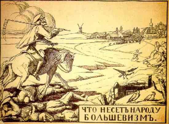 Ваши родные и близкие стонут под игом большевистских комиссаров, они мрут от насилия и голода, они зовут вас. Идите же спасать их!