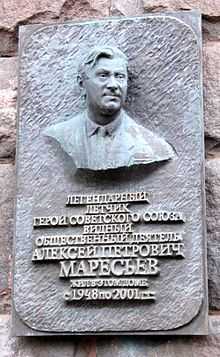 - Мемориальная доска на доме в Москве, где Маресьев жил после войны[4].