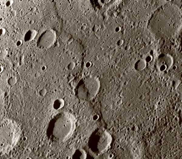 3. За 48 минут до максимального приближения зонда к Меркурию узкоугольная камера сделала фотографию поверхности планеты. Правый угол фото – это граница света и тени на поверхности планеты, поэтому тени длинные и яркие. Видны два горных образования. Восточный горный массив проходит через кратер, указывая, что он сформировался позже, чем сам кратер. Остальные кратеры имеют одинаковое равномерное дно.