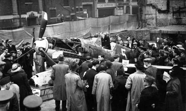 Демонстрация сбитого немецкого истребителя Мессершмитт Bf.109 жителям Лондона. Этот Bf.109E-4 «белый 5» под управлением немецкого летчика Ганса Георга Шульте был сбит и совершил вынужденную посадку недалеко от английской авиабазы Мэнстон 16 сенября 1940 года. До того как Шульте был сбит и попал в плен, на его счету числилось 8 английских самолетов, в том числе два «Харрикейна» и два «Спитфайра».