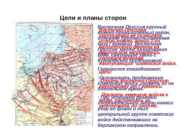 Как пояснял в своих мемуарах Василевский, «восточнопрусскую группировку гитлеровцев нужно было разгромить во что бы то ни стало, ибо это освобождало армии 2-го Белорусского фронта для действий на основном направлении и снимало угрозу флангового удара из Восточной Пруссии по прорвавшимся на этом направлении советским войскам». Согласно замыслу, общая цель операции заключалась в том, чтобы отсечь армии группы «Центр», оборонявшиеся в Восточной Пруссии, от остальных фашистских сил, прижать их к морю, расчленить и уничтожить по частям, полностью очистив от врага территорию Восточной Пруссии и Северной Польши. Успех такой операции в стратегическом отношении был исключительно важен и имел значение не только для общего наступления советских войск зимою 1945 года, но и для исхода Великой Отечественной войны в целом.