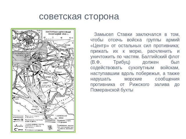 Сначала войска 3-го и 2-го Белорусских фронтов должны были согласованными концентрическими ударами отсечь восточнопрусскую группировку врага от его основных сил и прижать к морю. Затем войска 3-го Белорусского и 1-го Прибалтийского фронтов должны были окружить вражеские войска и уничтожить их по частям. При этом из 3-го Белорусского в 1-й Прибалтийский фронт, а из 2-го Белорусского в 3-й Белорусский передавалась часть войск. Ставка посылала на эти фронты дополнительные войсковые усиления из своего резерва. Предполагалось, что в ходе операции 2-й Белорусский фронт в тесном взаимодействии с 1-м Белорусским будет перенацелен для действий на основном направлении – через Восточную Померанию на Штеттин. В соответствии с произведенными Генеральным штабом расчетами, операция должна была начаться в середине января 1945 года.