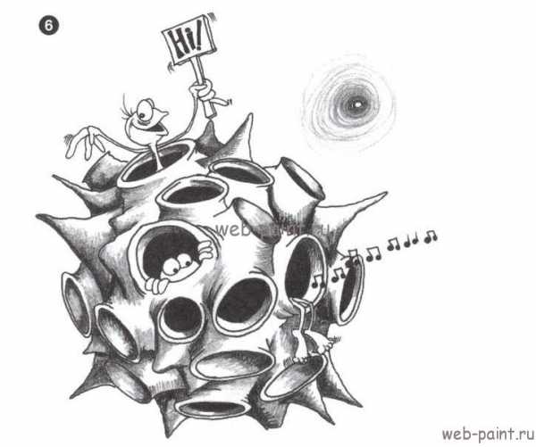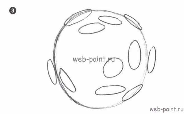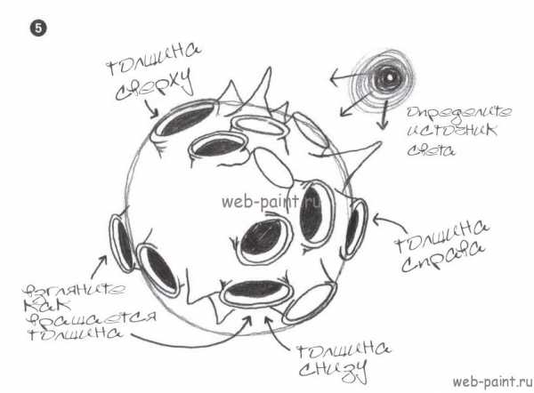 5. Обратите внимание, как я вращаю толщину кромки каждого кратера, согласно расположению их на поверхности астероида. Это отличное упражнение для практики. Напоминаю вам правило толщины: если кратер находится сверху, то толщина — сверху. Если кратер — справа, то толщина — справа. Если кратер (или окно, или дверь) слева, то толщина слева. И если кратер снизу, то толщина рисуется снизу.