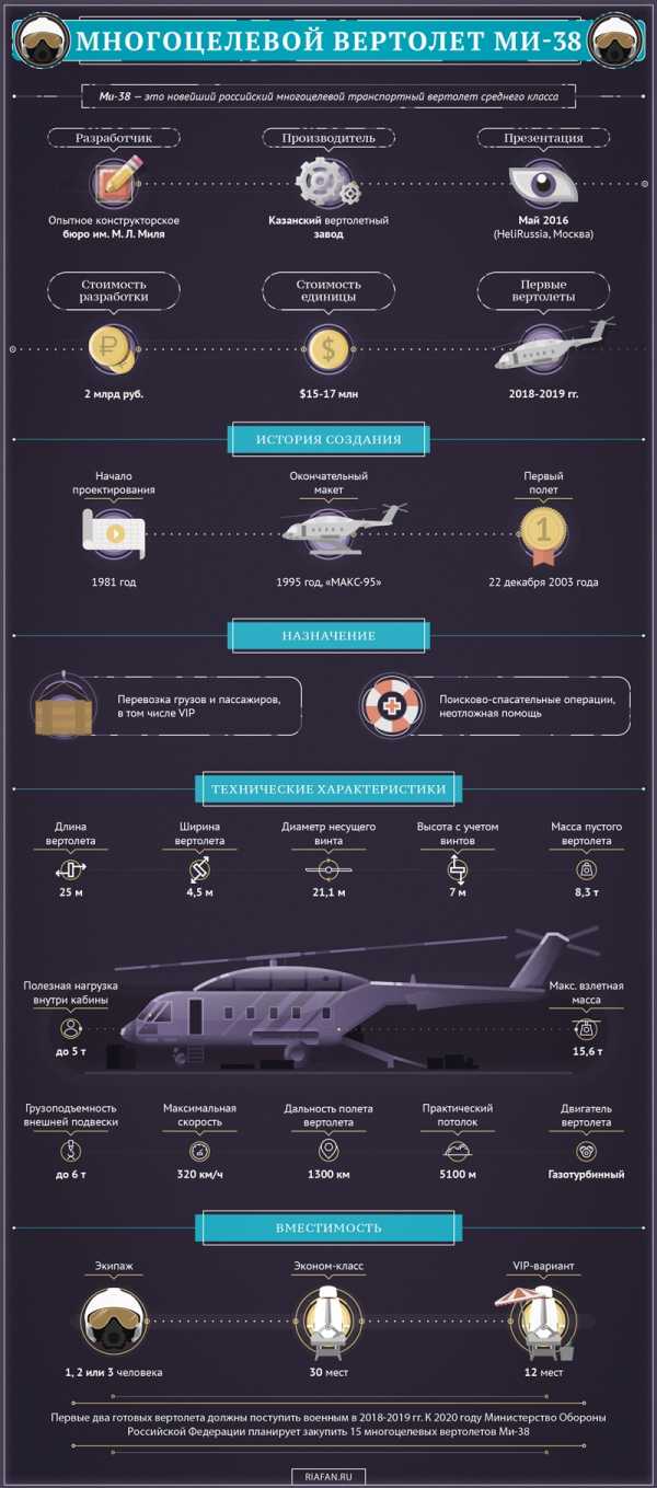 Разработка многоцелевого вертолета Ми-38 с паузами ведется с 1981 года. В 1991 году был впервые представлен макет машины, а в 2003 году вертолет совершил первый полет. Ми-38 имеет в длину 19,9 метра, в ширину — 4,5 метра, а диаметр несущего винта — 21,1 метра. Машина способна развивать скорость до 320 километров в час и перевозить грузы массой от пяти до шести тонн на расстояние 1,3 тысячи километров.