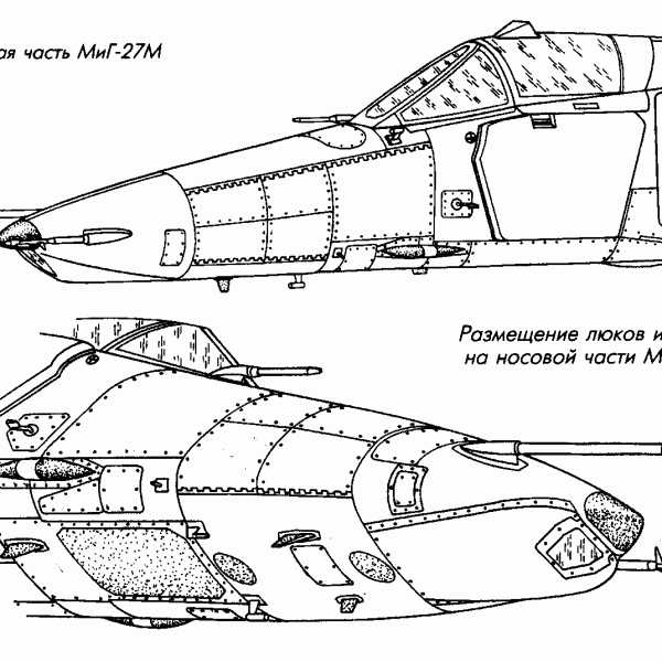 МиГ-27 – однокилевой высокоплан с крылом изменяемой стреловидности. Фюзеляж типа «полумонокок» собран из стали и алюминиевых сплавов, причём для соединения панелей использовались и сварка, и клёпка. Каждое крыло включает в себя неподвижную часть и поворотную консоль. Угол стреловидности изменяется при помощи гидропривода.