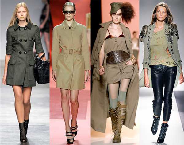 Одежда в стиле милитари, как мужская, так и женская, разнообразна – это и костюмы, и брюки, и юбки, и даже платья. Среди верхней женской одежды это, конечно же, тренч или тренчкот.