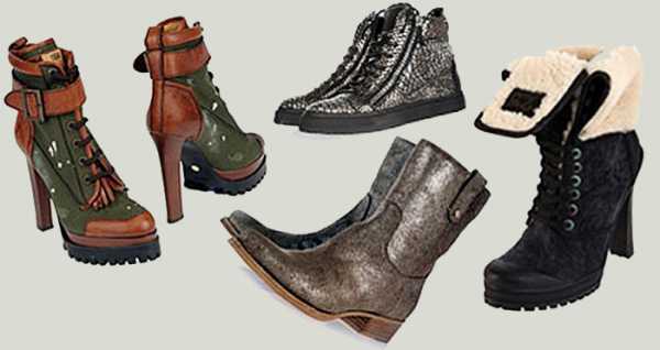 Из обуви очень стильно и колоритно смотрятся военные ботинки с массивной тракторной подошвой и высокие сапоги, сшитые из дорогой кожи.