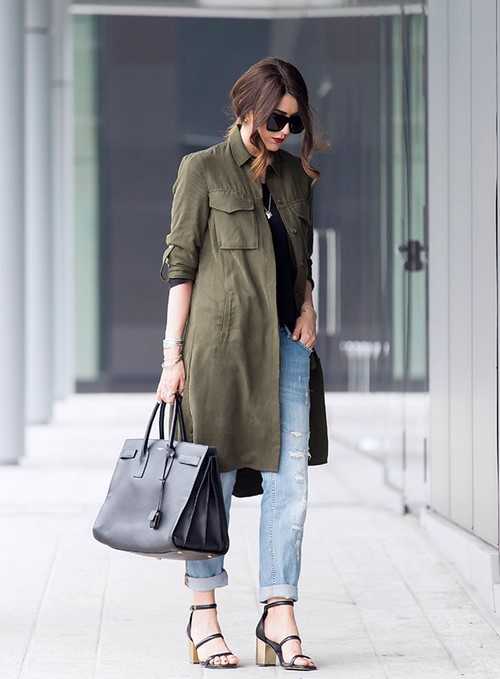 Добавив к одежде крупные очки, шляпу, строгий портфель и характерную обувь с ремешками, на низком ходу, с платформой, либо устойчивом каблуке, вы создадите очень стильный лук в военном стиле, которым точно привлечете внимание.