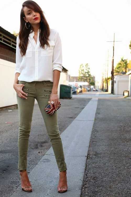 - Брюки милитари отлично смотрятся с шифоновой блузкой или хлопковой майкой. В качестве базового гардероба не мешает иметь эти вещи.