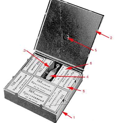 откидной на петлях крышкой (2). Внутри коробки помещалась тонкостенная