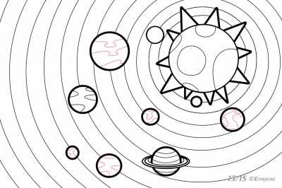 Сатурн известен своими кольцами, которые появились вокруг него. Изобразите несколько овалов по центру планеты. Нарисуйте лучи разной величины, которые отходят от Солнца.