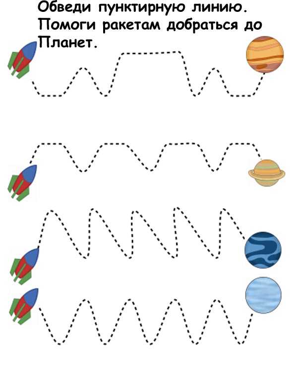 на развитие мелкой моторики пальцев рук малышей. Здесь нужно помочь ракетам попасть на Планеты — обвести пунктирную линию карандашом.