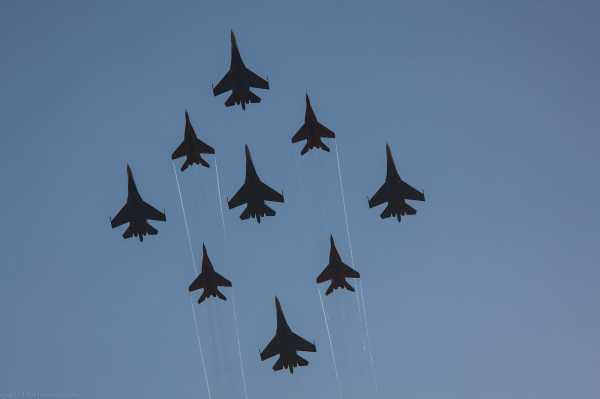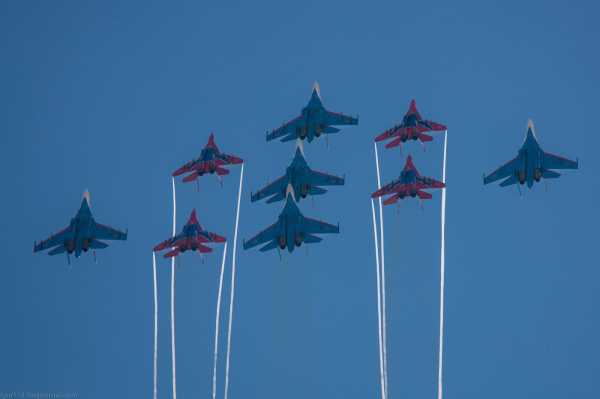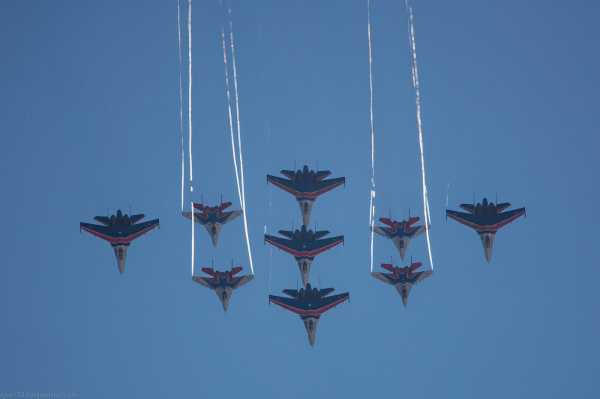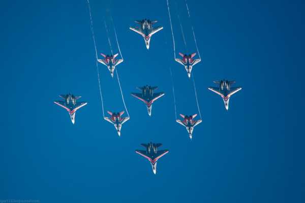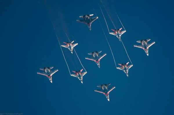 9 мая: Авиационные группы высшего пилотажа «Стрижи» (четверка МиГ-29) и «Русские витязи» (пятерка Су-27) продемонстрировали над Севастопольской бухтой вечернюю летную программу.