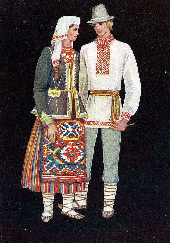 Мужчины носили недлинные сорочки туникоподобной формы, с длинным рукавом и глухо закрытой горловиной. Женщины шили себе длинные сорочки с большим, чем у мужчин, разнообразием покроя. Сорочка могла быть туникоподобной, с цельнокроеными рукавами или с плечевыми вставками. Поясной одеждой мужчин были штаны разного кроя, от шаровар до ногавиц (гачей), которые шили из домашнего сукна темного или светлого цвета. Женская поясная (набедренная) одежда почти не шилась, а изготавливалась из одного или двух-трех полотен ткани, которые по-особому обматывались вокруг бедер и закреплялись поясом. Ткань для этого бралась домотканая однотонная или с узорами. В разных регионах женская поясная одежда значительно отличалась формой, материалом, расцветкой и орнаментами.