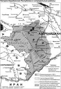 В 1921 г. Кавбюро РКП(б) приняло постановление о статусе Нагорного Карабаха: «Исходя из необходимости национального мира между мусульманами и армянами и экономической связи Верхнего и Нижнего Карабаха, его постоянной связи с Азербайджаном, Нагорный Карабах оставить в пределах Азербайджанской ССР, предоставив ему широкую областную автономию с административным центром в г. Шуше, входящем в состав автономной области»[28]. В июле 1923 года районы Азербайджанской ССР с преимущественно армянским населением (Шушинский, Джебраильский и части Джеванширского и Зангезурского уездов) были объединены в автономное образование (Автономная область Нагорного Карабаха (АОНК), с 1937 года — Нагорно-Карабахская автономная область (НКАО). В конце 1930-х гг. административно-территориальные изменения внутри Азербайджанской ССР привели к образованию так называемого Лачинского коридора, отделившего территорию НКАО от Армении.