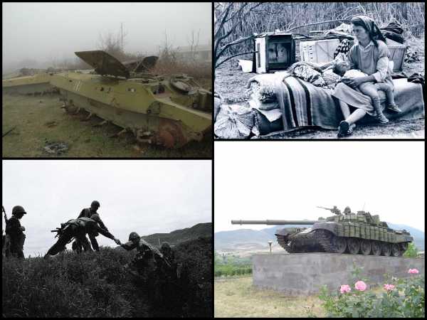Сверху по часовой стрелке: разбитые азербайджанские бронетранспортёры (2005), внутренне перемещённые лица — азербайджанцы с территорий, перешедших под контроль армян (1993), танк — памятник в Аскеране (2007), армянские солдаты (1994) | |