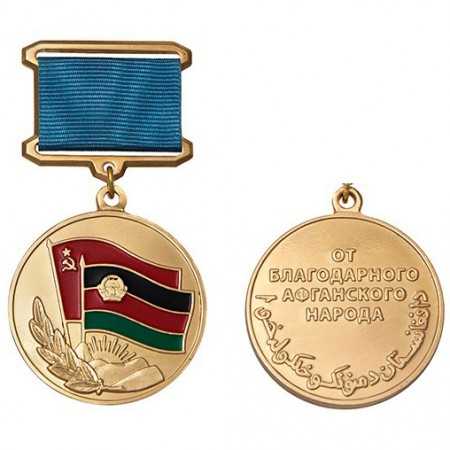 Указанный знак почета считается вторым среди наиболее распространенных наград времен Афганской войны. На те времена медаль с характерной гравировкой «От благодарного афганского народа» выдавали всем участникам боевых действий и просто служащим в ДРА в момент вывода войска. Награда представляет собой округлую золотую медаль с двумя флагами – СССР и Афганистана.