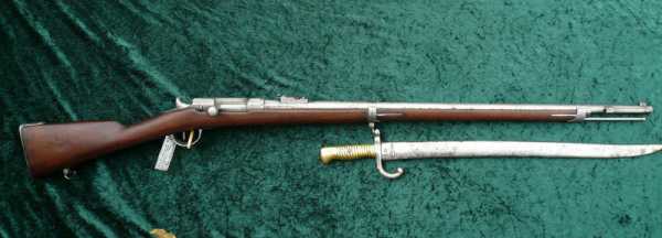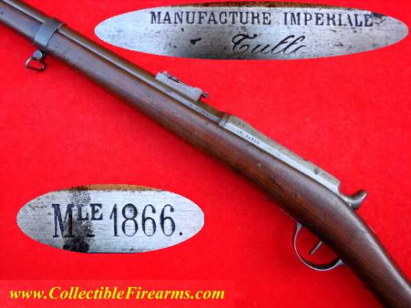 - Le fusil Mle1866 — винтовка Шасспо первого образца с бумажным патроном. На прицел нанесены деления от 200 до 1200 метров.
