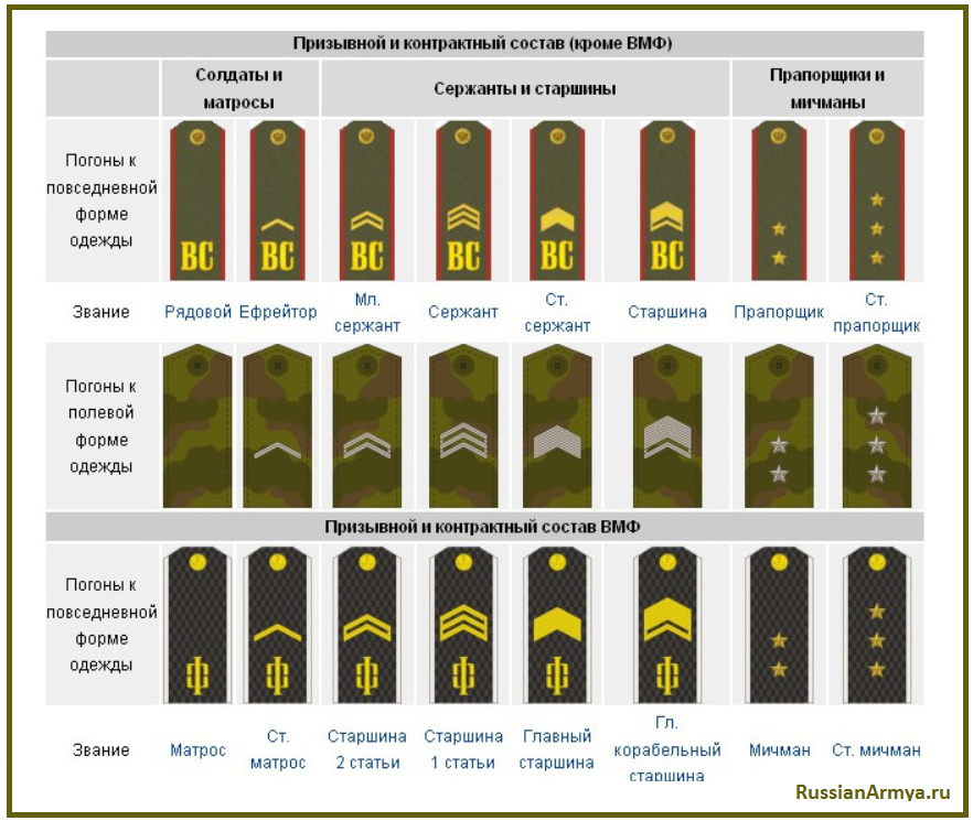 Это категория людей, не проходивших специального обучения. При поступлении на службу солдату присваивается звание рядовой. Погоны абсолютно пустые, без отличительных знаков. Набор обязанностей – минимальный. При хорошем несении службы солдат может быть повышен до ефрейтора. Это воинское звание в армии России относится к отличившимся рядовым, на плечо помещается лычка (второе название нашивки – галун).
