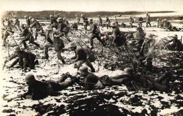Немецкие солдаты атакуют французские укрепления под Верденом, 1916 год.