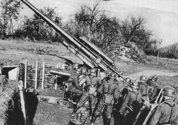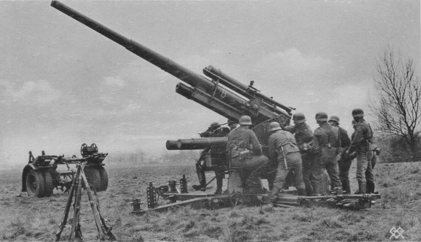 В оккупированной Европе во время Второй мировой войны 88-мм орудия часто использовались для обстрела высоколетящих бомбардировщиков союзников. Тяжелое орудие могло поднять свой 20,25-фунтовый осколочно-фугасный снаряд на высоту более 30 000 футов со скоростью около 15 снарядов в минуту. При прямом попадании снаряд «88» часто полностью уничтожал бомбардировщик.