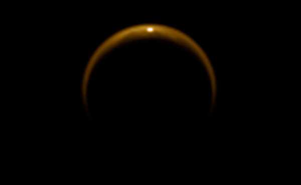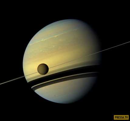 Гигантская луна Титан. Крупнейший спутник Сатурна, второй по величине спутник в Солнечной системе (после спутника Юпитера Ганимеда), является единственным, кроме Земли, телом в Солнечной системе, для которого доказано стабильное существование жидкости на поверхности, и единственным спутником планеты, обладающим плотной атмосферой.