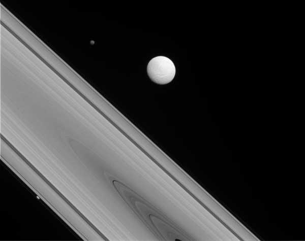 Два спутника Сатурна — Диона (рядом) и Энцелад (дальше). Диона состоит преимущественно из водяного льда со значительной примесью каменных пород во внутренних слоях.