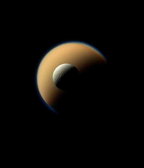 Гигантский спутник Титан и Диона на фоне колец Сатурна. (Фото NASA | JPL | Space Science Institute).