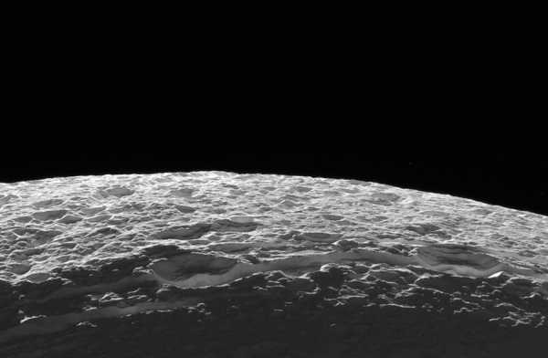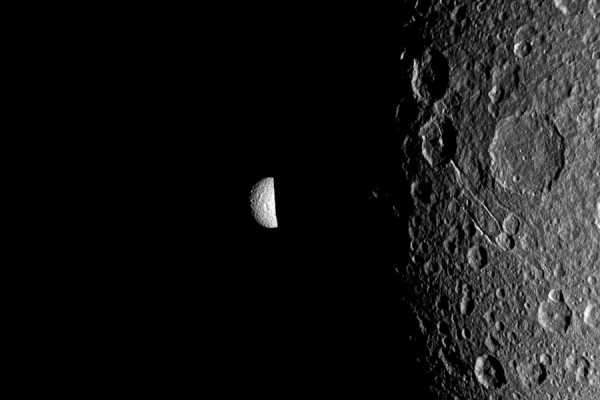 Мимас выглядывает из-за ночной стороны большого спутника Дионы. (Фото NASA | JPL | Space Science Institute).