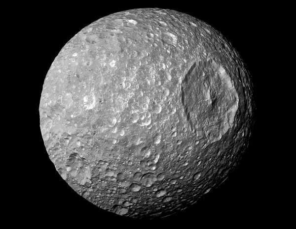 Спутник Мимас во всей красе. Имея размер около 400 километров, является двадцатым по величине спутником в Солнечной системе, а также самым маленьким известным космическим телом, которое имеет округлую форму из-за собственной гравитации.