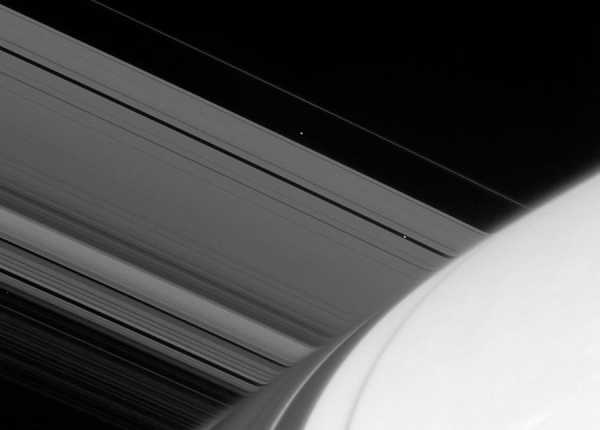 Сатурн, его кольца и яркие точки — спутники Атлас и Пан. (Фото NASA | JPL | Space Science Institute).