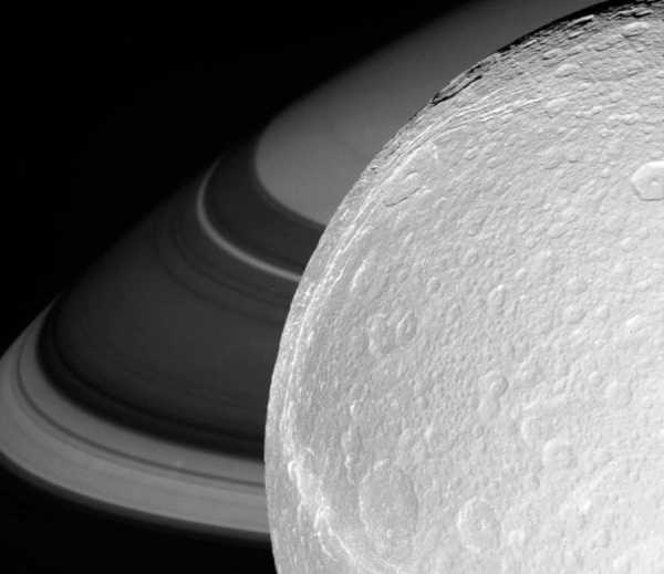 Диона на фоне Сатурна. (Фото NASA | JPL | Space Science Institute).
