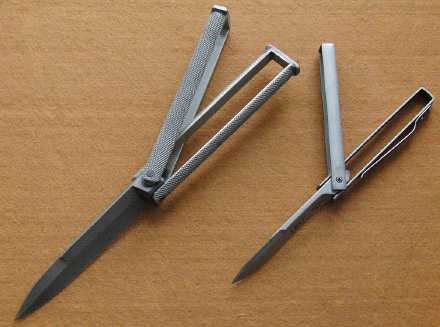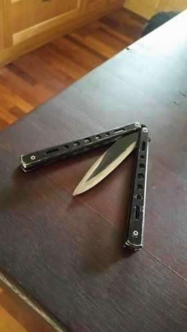 Забыл упомянуть, что у бабочки две рукояти: опасная (на ней и будет располагаться устройство запирания), над которой расположена режущая кромка, и безопасная- с обухом лезвия. Все манипуляции с ножом следует проводить держась за безопасную рукоять иначе травм не избежать!!!!