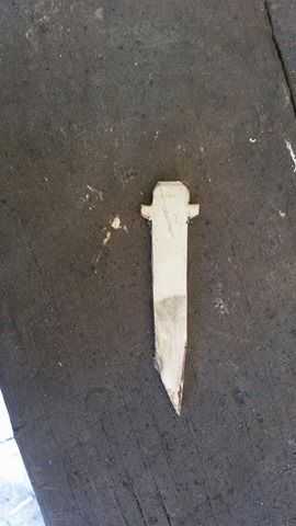Следующий шаг- выведение спусков. Гриндера у меня под рукой не завалялось, поэтому пришлось работать на обычном наждачном круге. Для сносной симметрии и удовлетворительной точности обработки приклеил на заготовку тот же эскиз из бумаги. Спуски вывел до толщины около 0,5 мм. Финишная заточка осуществляется в самый последний момент из соображений безопасности. Вот что получилось: