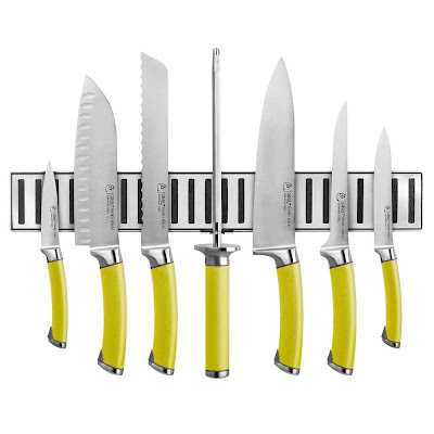 Набор из 8 ножей, который выпускается с инструментом для заточки и магнитной базой для их хранения, сделанной из нержавеющей стали.