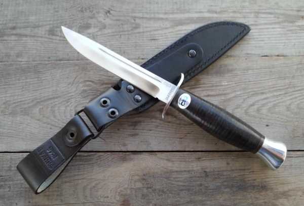 Ножны изготовлены из кожи коричневого или черного цвета и имеют петлю для крепления на ремне и фиксирующую нож кнопочную застежку.