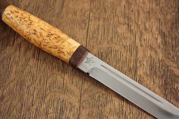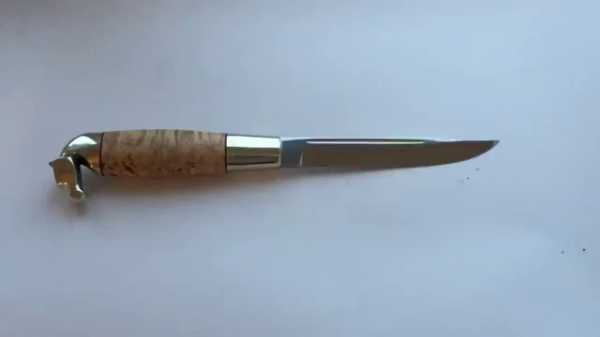 Обычно ручка финского ножа изготавливается из твердого дерева, так она плотно садится на черенок. Для фиксации не используются саморезы или заклепки. При производстве рыбацкого пуукко специально рассчитывается соотношение массы рукоятки и веса клинка. Такой нож никогда не тонет после падения в воду, он будет торчать, как поплавок.