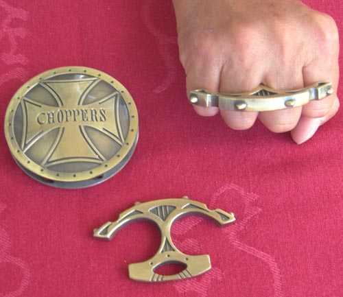 Сама конструкция пряжек начинает меняться, они становятся все более массивными и все менее пригодными для ношения в качестве пряжки. Исчезают петли для крепления ремня – теперь ремень нужно продевать в отверстие в ладонном упоре(в пряжках-кастетах американского типа). Постоянный зуб заменяют выкручивающимся шпеньком… В результате пряжка превращается в обычный кастет в комплекте к которому идет этот самый шпенек – чтоб предать легальность продаже такого кастета