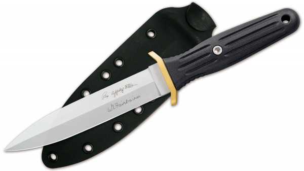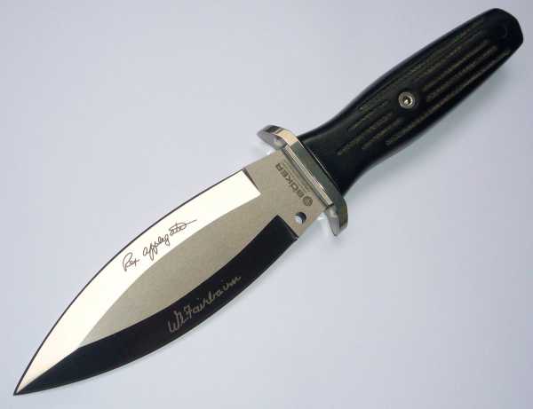 Нож английского спецназа представлен моделью “Boker Applegate-Fairbairn Fighting Knife” (A-F) с 15 см кинжального типа клинком из нержавеющей стали 44 и плоской удобной рукоятью круглой формы. Рукоять и гарда выполнены в черном цвете. Данный нож является инструментом вооружения британских коммандос.